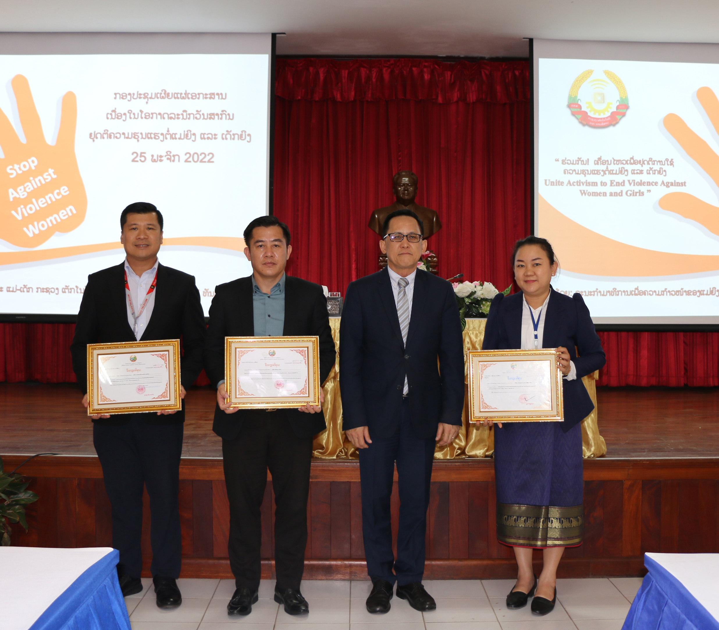 ໃນໂອກາດດຽວກັນນີ້, ຜູ້ເຂົ້າຮ່ວມໄດ້ຮັບຊົມວິດີໂອ ສານຂອງພະນະທ່ານ ນາຍົກລັດຖະມົນຕີ ແຫ່ງ ສປປ ລາວ ກ່າວ ເນື່ອງໃນໂອກາດລະນຶກວັນສາກົນຢຸດຕິຄວາມຮຸນແຮງຕໍ່ແມ່ຍິງ ແລະ ເດັກຍິງ 25 ພະຈິກ ປະຈຳປີ 2022 ແລະ ໄດ້ຮັບຟັງການເຜີຍແຜ່ເອກະສານກ່ຽວກັບການນຳໃຊ້ສື່ສັງຄົມອອນລາຍໃຫ້ມີຄວາມປອດໄພຕໍ່ແມ່ຍິງ ແລະ ເດັກຍິງ ຈາກກົມຄວາມປອດໄພໄຊເບີ, ກຕສ. ພ້ອມນີ້, ກອງປະຊຸມຍັງມີພິທີມອບ-ຮັບໃບກຽດຕິຄຸນ ແລະ ຍ້ອງຍໍ ໃຫ້ແກ່ ບໍລິສັດ ລາວໂທລະຄົມມະນາຄົມມະຫາຊົນ, ບໍລິສັດ ອີທີແອລ ຈໍາກັດ, ບໍລິສັດ ດາວທຽມລາວເອເຊຍ-ປາຊິຟິກ ຈໍາກັດ ທີ່ມີຜົນງານໃນການສະໜັບສະໜູນ ເພື່ອສະເຫຼີມສະຫຼອງວັນເດັກໂລກ 20 ພະຈິກ ແລະ ວັນສາກົນຢຸດຕິຄວາມຮຸນແຮງຕໍ່ແມ່ຍິງ ແລະ ເດັກຍິງ 25 ພະຈິກ ໃນປີ 2021 ແລະ 2022 ລວມມູນຄ່າທັງໝົດ 336,800,000 ກີບ.
